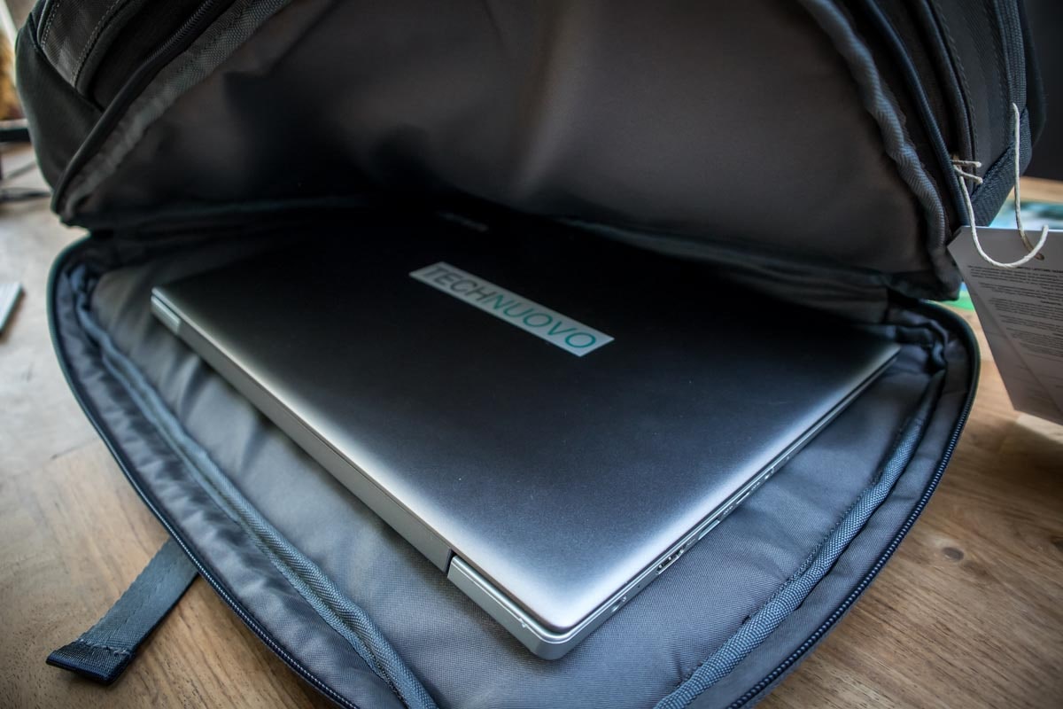 There are two main compartments to the bag. The first is accessed at the back and is the laptop area. It is just a padded compartment for your laptop and there are no straps for securing said laptop, so if it’s on the smaller size, it will move around.