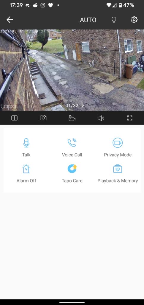 Once inside the Tapo app, I have access to what looks like up to 32 individual cameras, which is mental. If you’ve got a big enough place for 22 cameras, I’m sure it’ll look akin to a security room at a bank but for now, I’ve only got the one. The home screen stores your favourite products, and that’s where I can access my camera. Once selected, I’ve got full control of what my camera does. There’s a thumbnail view at the top, with options for taking screenshots and recordings and opening the other cameras. Under that I can use the built-in microphone to talk to people in front of the camera, from anywhere by the way as long as there’s an internet signal. I can make a voice call to the camera and even set of the alarm, which by the way sounds like a nuclear warning. It’s loud, and it’ll definitely deter a nighttime intruder.