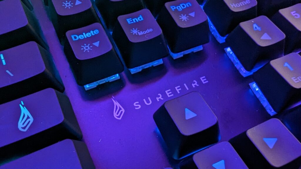 So, let’s start by talking about the Surefire Kingpin M2 keyboard. It’s a full-sized mechanical keyboard with a number pad on the right. There is an M1 version which is pretty much a TKL keyboard. The frame itself is made from a galvanised metal which gives the Kingpin M2 a real quality feel. It’s super heavy as well which was surprising when I first took it out of the box. It features multi-optional RGB lighting and there’s a partner software that you can download from the Surefire support page, but more on that in a moment as it’s a peculiar story. You can use keyboard shortcuts to set your RGB lighting effects, and there’s a guide on how to do that on the support page too. It uses mechanical Red switches and actually feels quite nice to type on, and the keys have quite a satisfying click to them.
