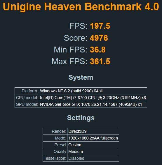 Heaven at Medium settings – because it kept defaulting back to medium for some reason – and at 1080p with 2x Anti-Aliasing, as well as some extra graphical settings turned on like ambient occlusion, volumetric shadows and refraction switched on had an average FPS of 197.5 and a score of 4976. The minimum rate touched 36.8 momentarily but the maximum launched to 361.5.